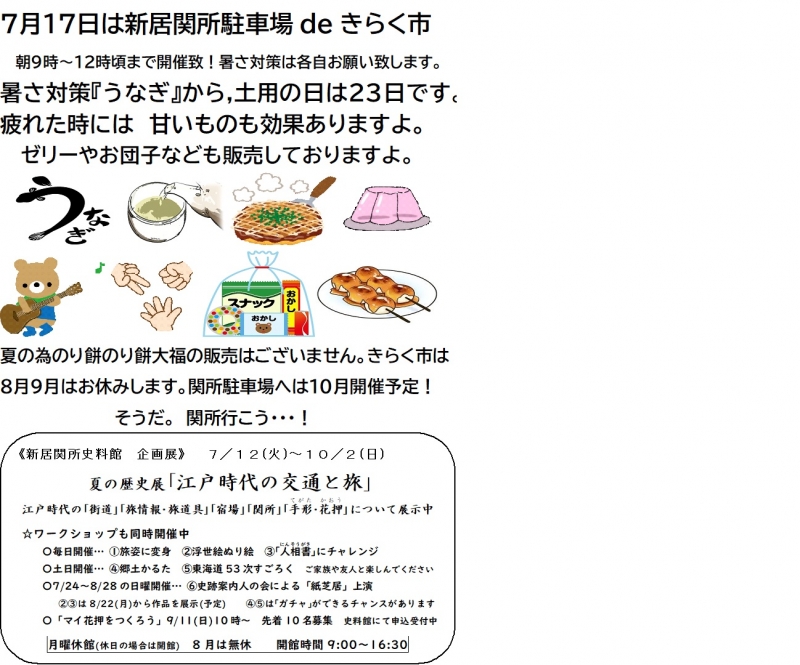 2022年7月17日湖西市新居関所駐車場にて開催しております。同時開催の森の熊音楽会ミニライブも開催致します。投稿者:光栄理容店 作成日:2022/07/14 07:24:57 更新日:2022/07/14 07:24:57