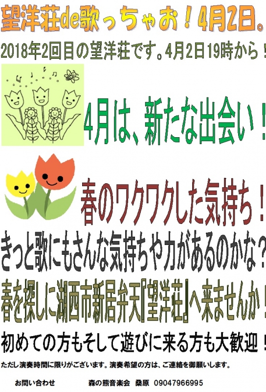 4月2日午後18時開場19時開演で湖西市新居弁天望洋荘で行われます。