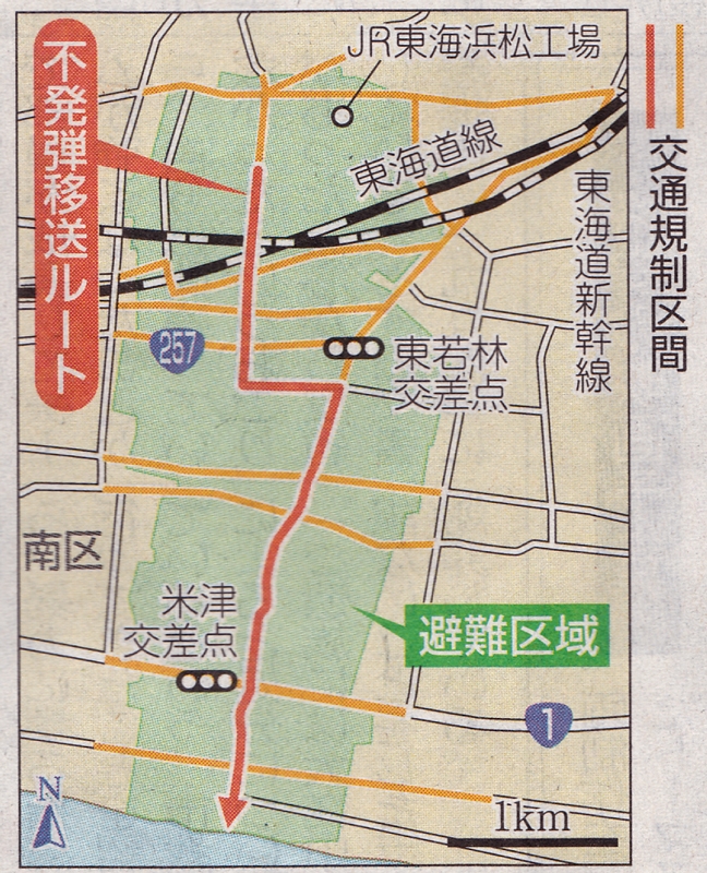 処理は午前8時~午後5時を予定し、不発弾をJR工場から約4キロ先の遠州灘海岸まで運び、爆破処理する。