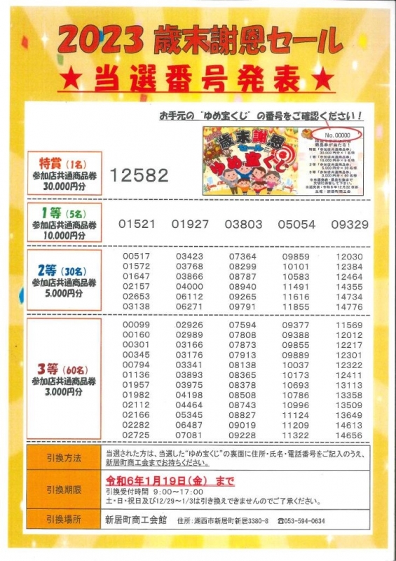 新居町商工会歳末謝恩セールが12月2日~17日まで開催されていました。本日22日に当選者発表が行われました。当たった方は新居町商工会へお手数ですが交換をお願いします。交換機感は1月19日までです。本日から使う事が出来2月29日まで有効期間です。