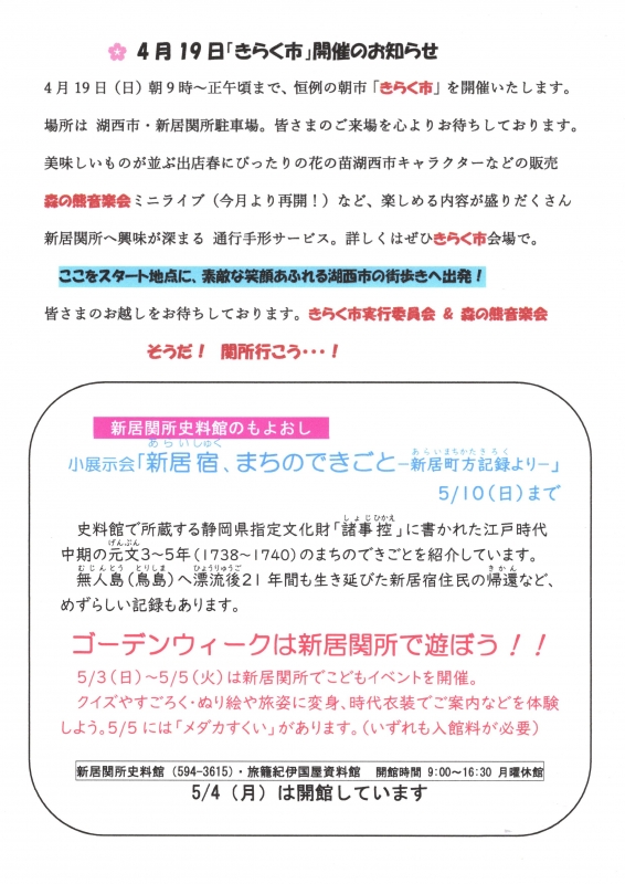 3月15日は湖西市新居関所できらく市