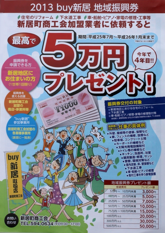 期間は平成25年7月~平成26年1月末までありますから新居町商工会加盟業者さんにご相談ご依頼ください。